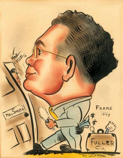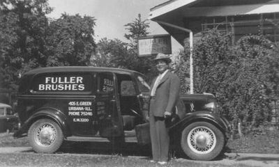 A footnote - While my novel deals with the Fuller Brush Company indirectly, it has a role as co-star in my novel. A local Champaign-Urbana acquaintance, Dewey Hollingsworth, shared a caricature and photo of his father who was a local Fuller Brush Man in my home town. Please enjoy them to your right and below.